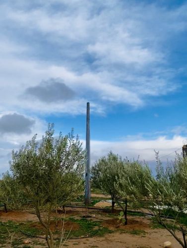 طريق حاسي العش واد بوتشيشة تبعد عند الطريق ب1.5كم مساحتها 1.1 هكتار(11 قطار) فيها حوالي 1000 شجرة زيتون ورمان +كازارينا فيها سكن.مستودع.بئر.ري بالتنقيط.كهرباء